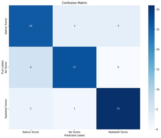 The mean accuracy values for all classes were 84.8% for trinary classification and 90.9% for binary classification. Regarding all three classes, the highest accuracy was achieved for the classification of irradiated choroidal melanoma (94.0%). The mean precision, recall, specificity, and F1 score values across all three categories were recorded as being 0.85, 0.85, 0.91, and 0.85, respectively. The confusion matrix presented in