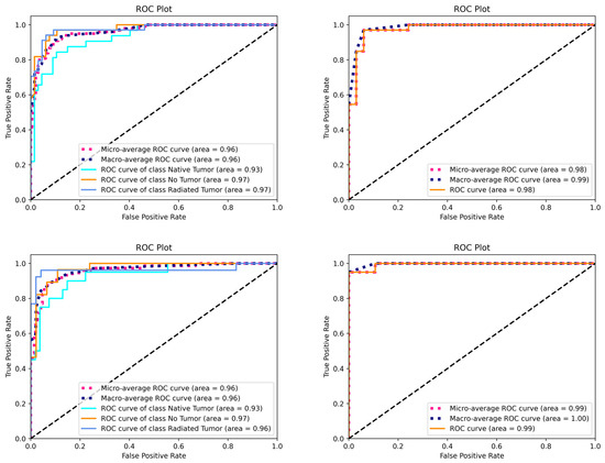 Figure 8. The ROC analysis demonstrates high averaged AUC values ranging from 0 to 1.00, with the best diagnostic performance being for binary classification based on Clarus images.