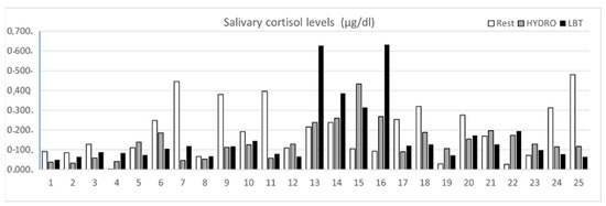 Salivary cortisol concentration values at rest, post-HYDRO, and post-LBT collected in each of the 25 children. On the X-axis, for each child, three bars are represented. White bars represent resting salivary cortisol values; grey bars, the post-HYDRO salivary cortisol values; and black bars, the post-LBT salivary cortisol values. The Y-axis represents cortisol values in micrograms per deciliter (µg/dL).