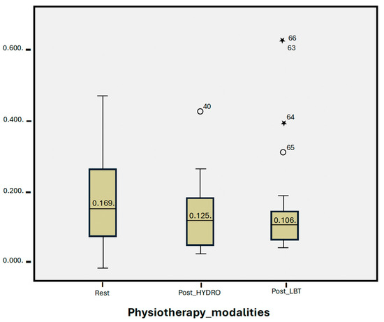 Our analysis shows that both HYDRO and LBT show a trend towards a reduction in salivary cortisol, despite not significantly lowering levels (Figure 3). In our study, cortisol levels were slightly higher after HYDRO than after LBT, but the difference was not statistically significant. However, several other studies have reported that HYDRO more effectively reduces cortisol levels. In 2016, Oliveira-Tobinaga et al. [11] evaluated the effects of hydrokinesiotherapy in 15 premature newborns treated in a NICU, finding a statistically significant reduction with respect to preintervention cortisol levels, from 0.41 ± 0. 14 µg/dL to 0.29 ± 0.09 µg/dL (p = 0.004). In 2018, Freitas et al. [23] conducted a similar study, but in this case, the therapy session did not involve movement in the water, only immersion. These authors observed a tendency for cortisol levels to increase, but the difference was not statistically significant. Also in 2018, Shaw et al. [32], evaluated stress levels in preterm newborns after an assisted physical exercise program, finding a significant reduction in salivary cortisol of 0.08 µg/dL (95% CI: −0.16 to −0.002; p = 0.04) at 30 min post-exercise, compared to the value at rest. No differences were found at 90 and 120 min post-exercise, compared to the values at rest. These findings suggest that exercise therapy does not increase levels of stress in the child. In addition, improvements were observed in physiological parameters, mineral content, and bone growth levels. In 2021, Durán-Carabalí et al. [33] assessed stress via salivary cortisol and alpha-amylase in 41 children aged 6–86 months with cerebral palsy (CP) who underwent a neurodevelopmental treatment program. These authors recorded higher baseline cortisol values in the CP group than in the control group (healthy children). However, cortisol levels at 20 min post-intervention were significantly lower than at baseline and at 5 min post-intervention. The participation of caregivers in performing the therapies had no significant effects on cortisol levels. In 2021, Kiebzak et al. [3] evaluated cortisol levels after Vojta therapy and measured an immediate post-intervention salivary cortisol increase to 12.5 nmol/L. However, at 20 min post Vojta therapy, the levels had decreased significantly, to 9.5 nmol/L, but remained above the pre-intervention values. In 2009, White-Traut et al. [34], studied stress reactivity via pre-intervention, immediate post-intervention, and 10 min post-intervention cortisol levels, comparing a tactile stimulation therapy (massage) with a multisensory stimulation therapy (massage plus other stimuli). These authors found statistically significant differences (p = 0.01), with slightly lower cortisol levels for multisensory therapy than for tactile stimulation alone. In 2021, Tai and Lau [35] assessed salivary cortisol levels after a kinesiological education program (brain gymnastics) in 37 children aged 3 to 6 years with special educational needs. The intervention was conducted once weekly, for an hour, over a total period of ten weeks, after which a decrease in cortisol levels was recorded. However, the results were not significant. Finally, in 2020, Efe et al. [36] reported a decrease in serum cortisol levels after an exercise program for very low-weight preterm newborns treated in a NICU. Bone mineral density levels were also enhanced.