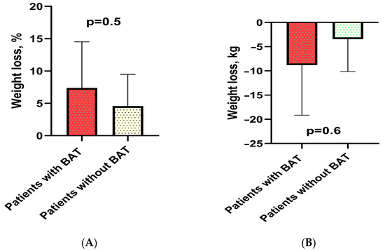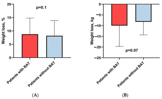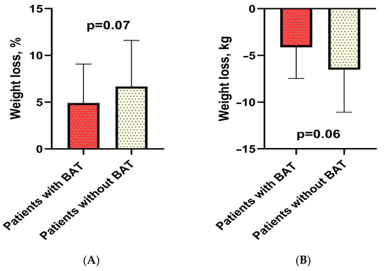 Dynamics of weight loss percentage in patients with and without BAT (A). Trend in weight loss in kilograms in patients with BAT versus without BAT (B).
