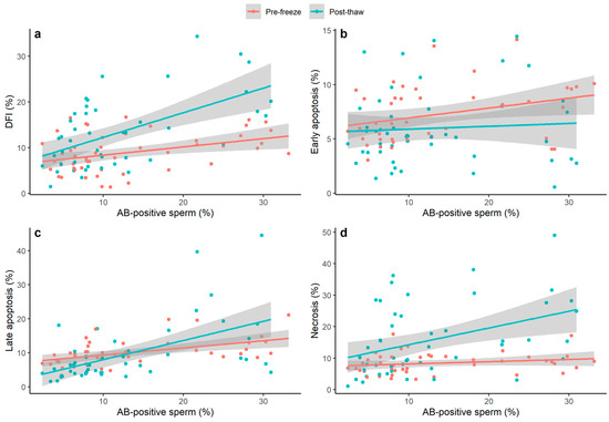 Linear mixed models were used to test for a possible interaction effect between the proportion of AB-positive sperm (%) and the freeze status of the sample (pre-freeze or post-thaw) on the proportion of DNA fragmented, early apoptotic, late apoptotic, and necrotic sperm (%); a significant interaction effect was observed for the proportion of DNA fragmented, late apoptotic, and necrotic sperm (Figure 1).