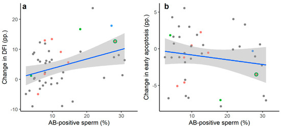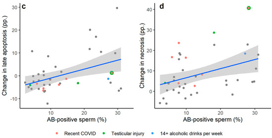 The association between the percentage of pre-freeze AB-positive sperm in the neat ejaculate and the percentage point change in the following outcome variables following the freeze–thaw process: (a) DNA fragmentation index (DFI; percentage of TUNEL-positive sperm); (b) Early apoptosis (percentage of Ann+/7-ADD− sperm); (c) Late apoptosis (percentage of Ann+/7-ADD+ sperm); (d) Necrosis (percentage of Ann−/7-ADD+ sperm). Data shown are raw values with linear trend lines (±95% CI). Significant Spearman’s rank-order correlations were observed between the proportion of AB-positive sperm in the neat ejaculate and the percentage point change in DFI (rs = 0.366, p = 0.014) and necrosis (rs = 0.403, p = 0.009). A non-significant correlation was observed for the percentage point change in late apoptosis (rs = 0.307, p = 0.051), and no significant correlation was observed for early apoptosis (rs = −0.133, p = 0.408). Coloured data points represent individuals who reported testing positive for COVID-19 within three months prior to sample collection, a history of testicular injury, or regularly consuming 14+ alcoholic drinks per week. N = 45 for DFI; n = 41 for measures of apoptosis and necrosis.