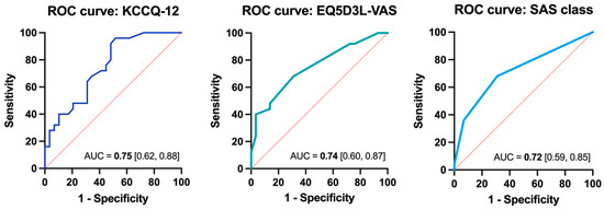 Figure 1. ROC with AUC for KCCQ-12, EQ5D-3L-VAS, and SAS class. AUC, Area Under the Curve; EQ-5D-3L. EuroQol-5 Dimension 3 level version; KCCQ, Kansas City Cardiomyopathy Questionnaire; ROC, Receiver Operating Characteristic; SAS, Specific Activity Scale; VAS, Visual Analogue Scale.