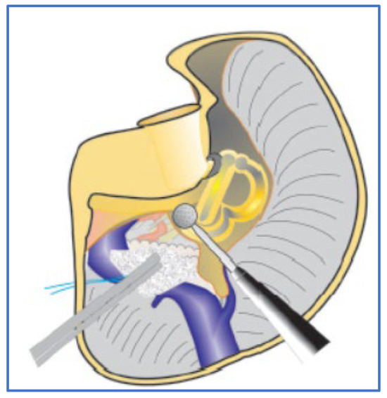 The labyrinthectomy involves drilling both the lateral and superior semicircular canals. However, the anterior part of the ampullae of these two canals is left intact to safeguard the facial nerve’s labyrinthine segment and to serve as a landmark for the superior vestibular nerve [12].