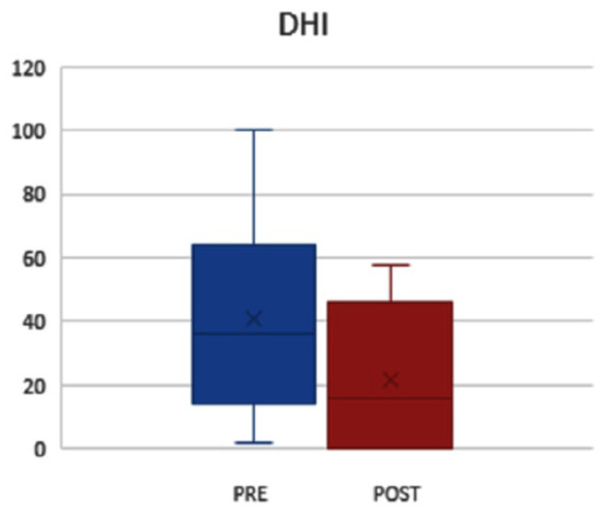Figure 6 shows a comparison of the values in the DHI before and after the intervention. There was a significant difference in the values of the DHI before and after the rehabilitation program, as they were considerably lower in the post-treatment time.