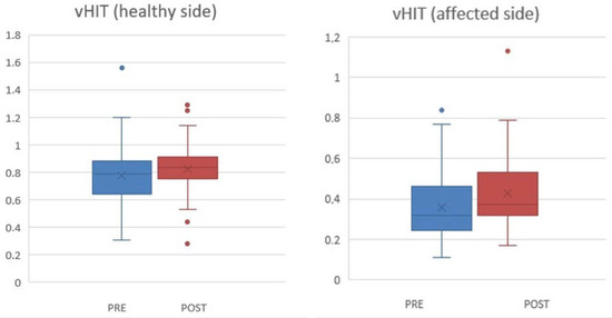 vHIT (HIMP) values before and after rehabilitation in the healthy and affected side, respectively. The box and whiskers illustrate the vHIT values in the healthy side pre- (mean value 0.77, SD 22) and post-rehabilitation (mean value 0.82, SD 0.19), p = 0.26, and in the pathological side pre- (mean value 0.36, SD 0.16) and post-rehabilitation (mean score 0.40, SD 0.18), p = 0.19. SD = Standard Deviation.