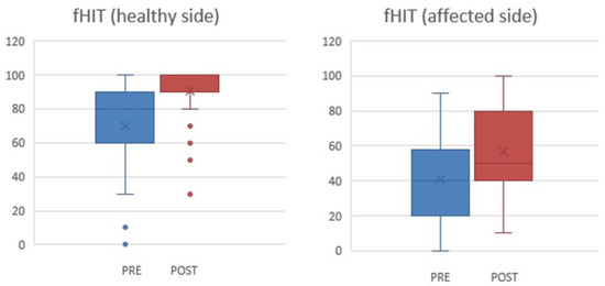 Interestingly, the scores of fHIT improved on both the pathological and healthy sides after the rehabilitation, revealing how intensive training improves the processing and integration of the vestibular stimuli, despite the low VOR values.