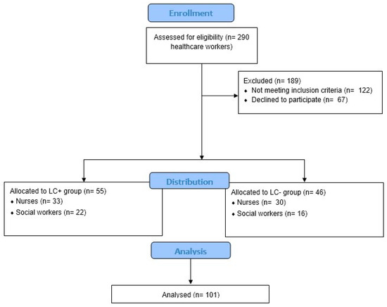 A sample of 101 nurses and HCWs returned their filled-in questionnaires (see Supplementary Tables S1 and S2). Of 101 subjects, 46 individuals (33 females and 13 males), with a mean age of 43.78 ± 11.03, had a history of SARS-CoV-2 infection but no symptoms of long COVID (LC−), whereas 55 individuals with a mean age of 44.91 ± 10.9 (42 females and 13 males) showed symptoms of long COVID (LC+). Specifically, LC− participants were made up of 30 (65.21%) nurses and 16 (34.78%) HCWs, while participants with LC+ included 33 (%) nurses and 22 (%) HCWs. In addition, we found that the distribution regarding educational level was different between nurses and HCWs (p < 0.03). In fact, regarding HCWs, only 7 out of 38 graduated from university; otherwise, nurses had mostly graduated and also had a master’s degree. For more details see Table 1 and Table 2.