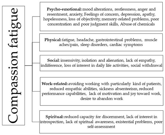 Compassion fatigue (CF) is a complex concept that is characterized by the inability to cope with emotional stress, due to long-term exposure to caregiving and suffering people. In the past, CF has been identified in patients’ caregivers suffering from post-traumatic stress syndrome. In 1992, Carla Joinson [1] adapted, for the first time, the concept of CF to healthcare professions. In general, most of the theories about CF are based on Figley’s concept of CF, which is defined as “a state of exhaustion and dysfunction, biologically, physiologically, and emotionally, resulting from a prolonged exposure to compassion stress” [2,3]. During the care process, CF can be explained as a phenomenon that can occur when the amount of compassion exceeds the capacity to cope or recover [4]. Healthcare professionals, such as nurses, may suffer from CF and have difficulty adequately caring for their patients, as caring for seriously ill patients is often a trigger for CF. For these reasons, CF is experienced by nurses, doctors, psychologists, and other health professionals, who may experience reduced work performance, tiredness (emotional and physical), stress, and depression [5]. CF is very similar to burnout and post-traumatic stress disorder and can have a relevant impact on the psyche and daily life, especially in the workplace [6,7]. Notably, CF differs from burnout in that it results directly from observing the pain of others, whereas burnout can develop without this exposure. In any case, Hinderer et al. [5] observed that CF often shares the same risk factors as those for burnout, such as hours per shift, work relationships, and coping mechanisms. Indeed, CF was more likely to occur in nurses who reported fewer hobbies, weaker coworker relationships, 12 h rather than 8 h shifts, and the use of medicinal substances. Furthermore, they observed that 27.3% of nurses exposed to trauma reported CF, leading to various difficulties. Indeed, CF has a profound impact on the emotional and cognitive well-being of healthcare professionals. Psychologically, CF manifests itself through significant emotional exhaustion and cognitive difficulties [7,8]. Figley describes CF as a state in which caregivers experience symptoms such as intrusive thoughts and intense emotional distress, despite not having personally experienced the trauma [2,3]. The emotional symptoms of CF also include increased feelings of anxiety and depression, as “caregivers” may have difficulty managing their mental health while attending to the needs of others. Thus, the most common CF difficulties concern the emotional, physical, cognitive, social, and occupational levels [8,9,10].
