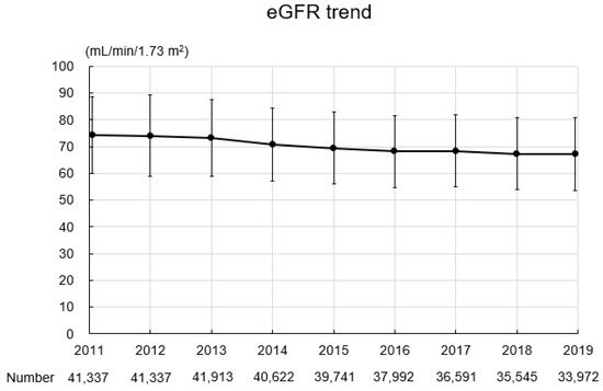 The baseline characteristics of the study participants are summarized in Table 2. In total, 349,050 records were obtained for 41,337 participants (16,918 men, 24,419 women; mean age: 64.0 ± 6.9 years; BMI: 22.8 ± 3.2 kg/m2). Four thousand five hundred and sixty-one participants (11.0%) had a past or current history of smoking. The mean SBP and DBP were 128.2 ± 16.2 mmHg and 76.3 ± 10.6 mmHg, respectively. The mean hemoglobin level was 13.8 ± 1.3 g/dL, the mean uric acid level was 5.2 ± 1.3 mg/dL, the mean triglyceride level was 108.9 ± 68.0 mg/dL, the mean HDL-C level was 63.8 ± 15.8 mg/dL, the mean LDL-C level was 126.2 ± 30.0 mg/dL, and the mean hemoglobin A1c level was 5.9 ± 0.6%. Urinary protein grades were −, 86.0%; ±, 8.8%; 1+, 4.0%; 2+, 1.0%; and ≥3+, 0.2%. Figure 3 shows the eGFR trend during the study period. The mean eGFR at baseline was 74.3 ± 14.2 mL/min/1.73 m2, and eGFR gradually declined during the study period.