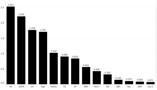 Importance of each parameter in terms of its association with eGFR after 1 year. Abbreviations: BMI, body mass index; DBP, diastolic blood pressure; eGFR, estimated glomerular filtration rate; Hb, hemoglobin; HbA1c, hemoglobin A1c; HDL-C, high-density lipoprotein cholesterol; LDL-C, low-density lipoprotein cholesterol; SBP, systolic blood pressure; SM, smoking history; TG, triglyceride; UA, uric acid; UP, urinary protein.
