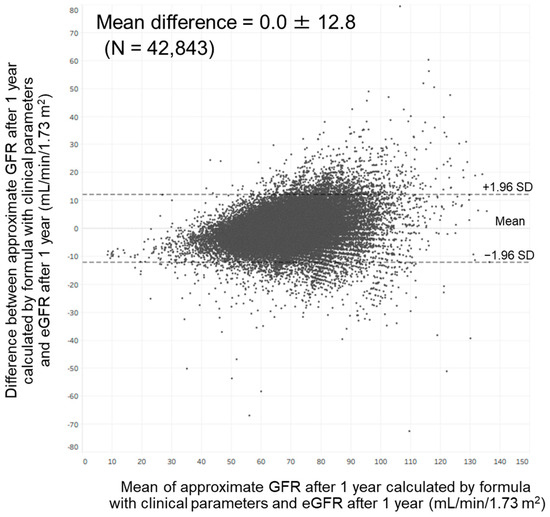 Bland–Altman analysis showed a moderate agreement between approximate GFR after 1 year calculated by our formula with clinical parameters and eGFR at that time. In total, 97.7% of the points were included within the mean difference ± 1.96 standard deviation (0.0 ± 12.8) (Figure 5). This analysis also showed a moderate agreement between approximate GFR after 1 year calculated by our formula with annual changes in clinical parameters and eGFR at that time. In total, 97.6% of the points were included within the mean difference ± 1.96 standard deviation (0.0 ± 12.1).