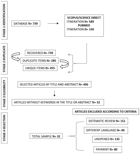 The scope of this research focuses on analyzing systematic reviews by applying the PRISMA method [32]. The first stage involved identifying the research question and proceeding with data collection. Initially, a total of N = 739 articles were obtained. In the second stage, duplicate articles (N = 285) were identified and excluded. In the third stage, the remaining articles were assessed according to the inclusion criteria (human participation, treatment to improve executive functions, people diagnosed with ADHD, and articles in English and Spanish) and exclusion criteria (languages other than Spanish and English, systematic reviews, books or theses, paid access, or articles that proposed interventions not aimed at improving executive functions in ADHD), resulting in the exclusion of N = 406 articles. Consequently, in the fourth stage, a selection of N = 32 articles was made and used in this research. In the fifth stage, the statistical analysis is presented. Finally, in the sixth stage, the summary collation and dissemination of the results are carried out through the application of the analytical framework (Figure 1).