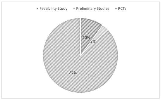 Feasibility studies, preliminary studies, and randomized controlled trials (RCTs) were the main research designs we encountered. RCTs stood out as the most prevalent. Check out Figure 2 to see their prominence.