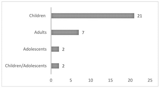 In terms of the life stage of individuals who underwent treatment, there were 21 studies involving children, followed by 7 studies in adults. Additionally, 2 studies encompassed adolescents and a combination of children and adolescents. These data are presented in Figure 4.