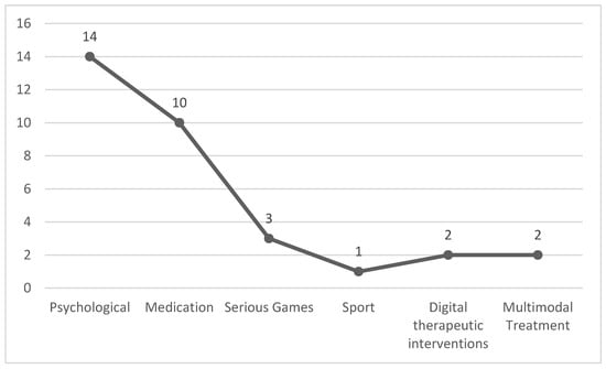 In the articles, various treatments were implemented to improve executive functions in individuals diagnosed with ADHD. The primary treatments included methylphenidate and mindfulness, followed by transcranial anodal direct current stimulation and viloxazine, among others. Psychological treatments were predominantly used, featured in 14 studies, followed by medication in 9 studies. Conversely, treatments such as polyamines and sports received the lowest number of studies. This distribution is visualized in Figure 5.
