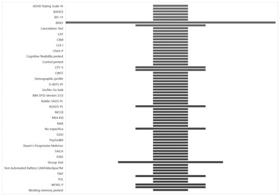 In the articles, various tests were administered, with the BRIEF used in 6 studies and the Stroop test used in 3 studies. These tests were used to identify the presence of ADHD and assess executive functions. Explore Figure 6 to visualize the distribution of these tests across the studies.