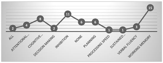 In the analysis of the results, there was evidence of improvement in executive functions, although not uniformly across all aspects. Notably, working memory demonstrated the highest score in 15 studies, followed by inhibition in 12 studies, and cognitive flexibility in 5 studies. However, processing speed and sustained attention showed the lowest scores, each with only 1 study. To identify the efficacy of the treatment received with executive functions, a significant association was found between improving executive functioning and the type of psychological treatment (x2 = 11.82, p = 0.03). Explore these findings further in Figure 8.