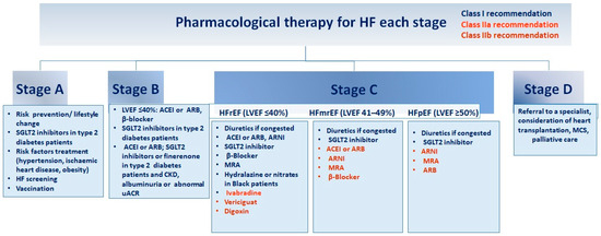 Guidelines for pharmacological intervention at every phase of heart failure. Recommendations for pharmacological therapy across the spectrum of HF stages, from risk prevention to advanced HF (stages A to D), are delineated below. Each treatment is color-coded based on the class of recommendation and level of evidence as outlined in HF guidelines. ACEI (angiotensin-converting enzyme inhibitor), ARB (angiotensin receptor blocker), ARNI (angiotensin receptor–neprilysin inhibitor), CKD (chronic kidney disease), GDMT (guideline-directed medical therapy), HFmrEF (HF with mildly reduced ejection fraction), HFpEF (HF with preserved ejection fraction), HFrEF (HF with reduced ejection fraction), LVEF (left ventricular ejection fraction), MCS (mechanical circulatory support), MRA (mineralocorticoid receptor antagonist), SGLT2 (sodium–glucose cotransporter 2), uACR (urine albumin-to-creatinine ratio). Adapted from Bozkurt, 2024 [4].