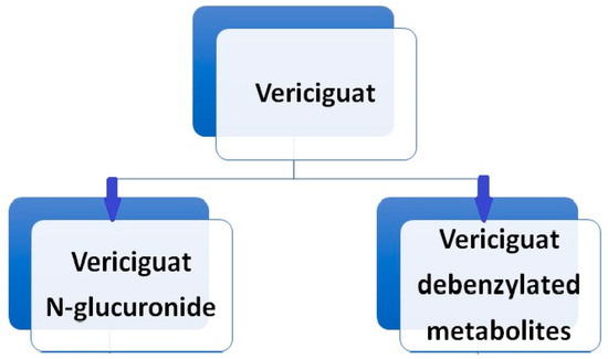 Vericiguat undergoes primarily glucuronidation, facilitated by uridine diphosphate-glucuronosyltransferase (UGT 1A9 and UGT 1A1), leading to the formation of N-glucuronide M-1, which lacks pharmacological activity against sGC. A minor fraction of the drug (<5%) undergoes metabolism via the P450 (CYP450) clearance pathway (Boettcher et al., 2020 [22]) (Figure 4). While sex and body weight are significant covariates in vericiguat’s volume of distribution, age, ethnicity, bilirubin, estimated glomerular filtration rate (eGFR), and albumin concentration do not affect the pharmacokinetics of vericiguat [23,24].