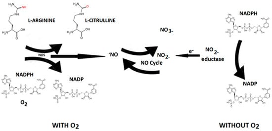 NO synthesis. In living organisms, NO can be produced by L-arginine through the action of NO synthase (NOS) through the consumption of reduced nicotinamide adenine dinucleotide phosphate (NADPH+) and oxygen that converts L-arginine to L-citrulline with NO production. NOS-independent NO formation can be interpreted as a contingency mechanism, ensuring adequate NO production in situations of limited oxygen supply.