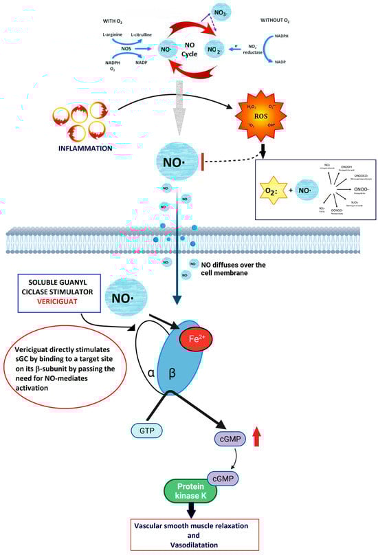 The dysregulation of the NO–sGC–cGMP signaling pathway can occur through oxidative stress, which alters the redox state of sGC, leading to the formation of oxidized and heme-free sGC (apo-sGC), rendering it unresponsive to NO. Endothelial dysfunction can also impair NO production, resulting in decreased NO bioavailability and reduced tissue cGMP levels. Additionally, other factors contributing to impaired NO–sGC–cGMP signaling include decreased levels of L-arginine due to arginase activity, the limited availability of L-arginine, the downregulation of nitric oxide synthase (NOS) in the vascular endothelium, NO inactivation by superoxide anion, elevated plasma concentrations of the endogenous NOS inhibitor ADMA (asymmetric dimethylarginine), disrupted sGC transcription, and the reduced stability of sGC mRNA. These dysfunctions can lead to various cardiovascular, cardiopulmonary, and cardiorenal diseases, such as pulmonary arterial hypertension (PAH) and other forms of pulmonary hypertension [37,38,39]. Acute inflammation can also have an effect on NO levels, as an increased concentration of TNFα can reduce eNOS activity [28].