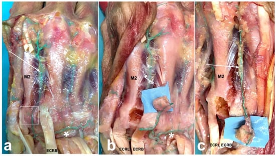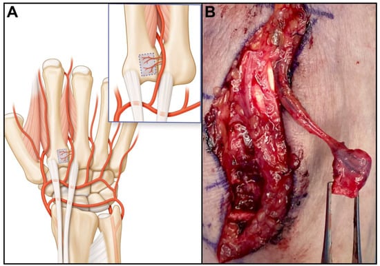 - Llusá-Pérez, M.; Forcada-Calvet, P.; Carrera-Burgaya, A.; Morro-Marti, M.R.; García-Elías Cos, M. Atlas of Dissection and Surgical Anatomy of the Wrist and Hand, 1st ed.; American Society for Surgery of the Hand: Chicago, IL, USA, 2022; pp. 115–116. [Google Scholar]