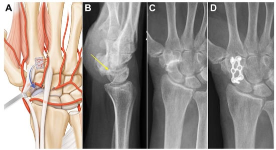 - Sheetz, K.K.; Bishop, A.T.; Berger, R.A. The arterial blood supply of the distal radius and ulna and its potential use in vascularized pedicled bone grafts. J. Hand Surg. Am. 1995, 20, 902–914. [Google Scholar] [CrossRef] [PubMed]