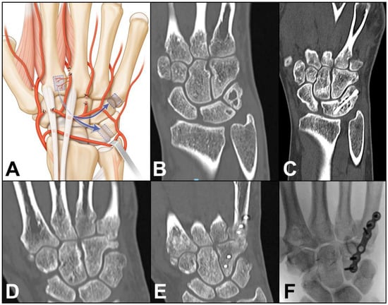 - Makino, M. Vascularized metacarpal bone graft for scaphoid non-union and Kienbock’s desease. J. Reconstr. Microsurg. 2000, 16, 261–266. [Google Scholar] [CrossRef]