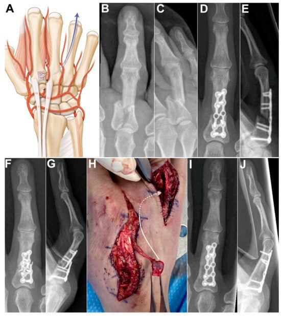 (A) Arterial anatomy, the distally based flap requires ligating the 2DMA proximally to the base of the second metacarpal as well as the palmar communicating branch; Case 4. (B,C) preoperative X-rays showing unstable and displaced intra-articular fracture of the first phalanx of the 4th ray. (D,E) postoperative X-rays, osteosynthesis with a dorsal plate and screws. (F,G) 7 months after osteosynthesis, X-rays showing unstable nonunion of the proximal phalanx after plate breakage; (H) Intraoperative photograph showing vascularized bone graft, dissection between extensor tendons and skin was made to allow passage of the vascularized 2nd metacarpal-base bone graft to the 4th ray (arrow). (I,J) postoperative X-rays demonstrating union of the phalanx.