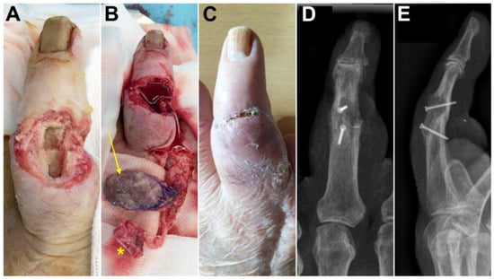 Case 5. (A) Photographs before surgery, dorsal aspect of the middle finger; (B) The elevated skin flap (arrow) and vascularized bone (asterisk); (C) postoperative photograph demonstrating a healed skin flap; (D,E) postoperative X-rays demonstrating fusion of the proximal interphalangeal joint.