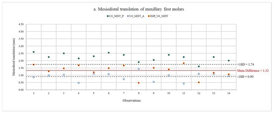Data of planned and actual mesiodistal translation, with mean difference and standard deviation of maxillary first and second molars. (a) Mesiodistal translation of maxillary first molars. (b) Mesiodistal translation of maxillary second molars. U6, maxillary first molar; U7, maxillary second molar; MDT_P, planned mesiodistal translation; MDT_A, actual mesiodistal translation; Diff, difference between planned and actual movements.