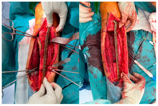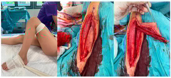 In every case, a combination of fibula free flap (FFF) with bone allograft, also known as the Capanna technique, was applied. Intraoperative photographs of the fibula free flap harvest are presented in Figure 1. All flaps were harvested as osteocutaneous flaps, including a skin paddle to facilitate postoperative clinical monitoring of fibula graft viability and to eliminate the need for imaging studies to assess the blood supply to the fully buried bony part of the flap.