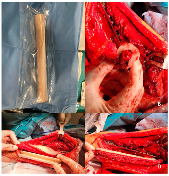 Intraoperative photographs presenting the Capanna technique. (A) Bone allograft obtained from a tissue bank; (B–D) insertion of a free fibula flap inside the bone allograft.