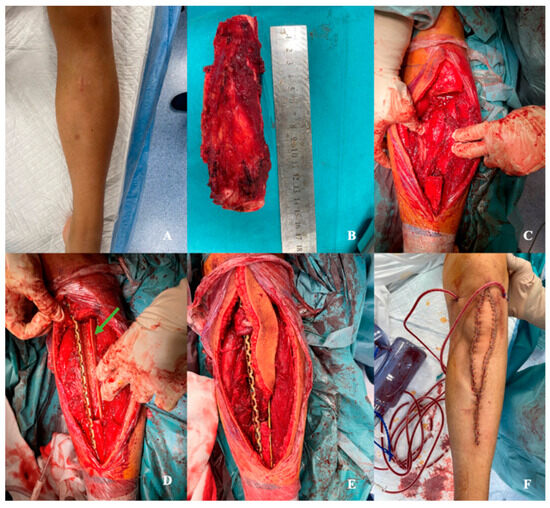 Intraoperative photos of a 14-year-old patient diagnosed with osteosarcoma of the left tibia, whose defect was reconstructed using the Capanna technique. (A) Preoperative photo of the left lower leg, visible scar from a surgical open tumor biopsy. (B) Resected specimen—more than 16 cm long together with adjacent tissues and the biopsy canal. (C) Extensive post-resection defect within the lower leg, visible stumps of the tibial bone. (D) Inset of the anastomotic plate and bone allograft (green arrow) into the bed of the resected tumor. (E) Implementation of a free fibula flap with a visible skin island into the bone allograft. (F) Postoperative photograph with a visible skin island as a ‘monitor of viability’ of the buried parts of the flap.