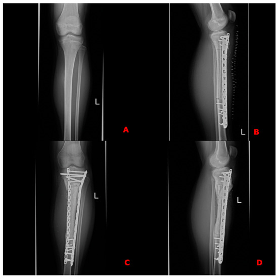 Since the tumors were located within the shafts of the long bones, with no involvement of the epiphyses in any case, reconstructions were performed using long diaphyseal intercalary grafts. The allograft combined with the fibula free flap was secured to the proximal and distal stumps of the tibia using locking compression plates (Figure 4D,E and Figure 5). These plates were used to facilitate earlier weight-bearing ambulation.