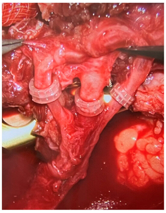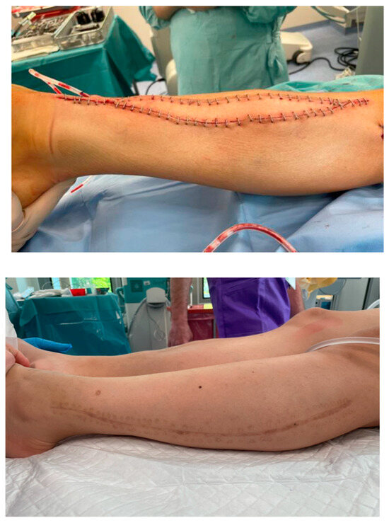 In microsurgery, the most common perioperative complication requiring urgent surgical intervention and frequently leading to partial tissue necrosis of the free flap is venous insufficiency, most commonly resulting from obstruction of the venous anastomosis [18]. Venous insufficiency is a much more common complication compared to arterial insufficiency regarding the free flaps. For this reason, in patients treated at the Institute of Mother and Child, in order to minimize the risk of the most common cause of flap perfusion impairment, two microsurgical venous anastomoses were performed during each procedure (Figure 6). One of them was performed in the deep venous system, the other in the superficial venous system.