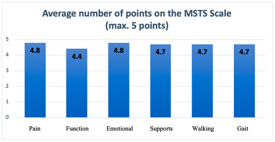 Patients included in the study were also evaluated by the surgical team based on the functional MSTS scale. The mean MSTS score was 27.2 points (range 23–30 points) (Figure 7). The lowest result was reported in the patient with a necrosis of the skin island postoperatively.