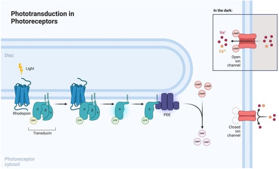 Phototransduction signaling pathway in photoreceptors. Reprinted from “Phototransdution in Photoreceptors” by Biorender.com (2024). Retrieved from https://app.biorender.com/biorender-templates (accessed on 1 June 2024).