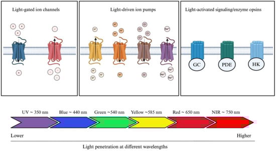 Opsins are G-protein-coupled receptors (GPCRs) and can be divided into two categories: microbial (also known as type 1 opsins, consisting of prokaryotes, algae, and fungi) or animal opsins (also known as type II opsins) [28]. Microbial opsins have been mostly studied for the treatment of IRD and can further be divided in three distinct subcategories, which consist of light-gated channels, light-driven ion pumps, and light-activated signaling/enzyme opsins (Figure 3) [29]. Microbial opsins use light as a substrate. Photostimulation induces opsin-mediated activation, silencing, or signaling pathway modulation of photoreceptors [30]. They function by absorbing light at a specific wavelength. Greater wavelengths are known to be associated with greater penetration rates (i.e., penetrating deeper into the skin) [31]. Blue light is the least penetrating at a wavelength of approximately 440 nm (peak sensitivity), whereas red light travels further given its approximate 650 nm wavelength (peak sensitivity) [32]. This phenomenon is partly explained by the different light scattering properties and absorption coefficients in human tissues [32,33]. Therefore, by modulating the wavelength properties of opsins, it is possible to modulate tissue penetration and opsin delivery within the human body. Given the greater penetrating ability of wavelengths greater than 650 nm, red or NIR wavelengths are preferred in optogenetic engineering, which is further discussed.