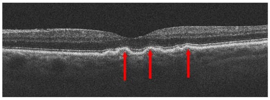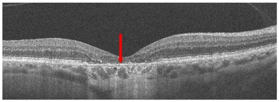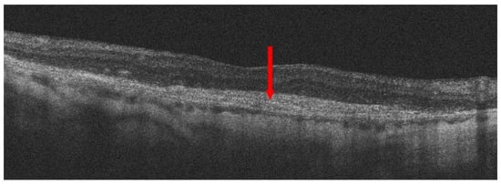 Non-neovascular AMD with subretinal fluid (SRF) is an important clinical entity that should be recognized to avoid anti-VEGF therapy, which is unnecessary in these patients. SRF may be due to drusen or drusenoid pigment epithelial detachment (PED) that is not associated with macular neovascularization but with retinal pigment epithelial decompensation or dysfunction []. Figure 5 shows an example OCT scan.
