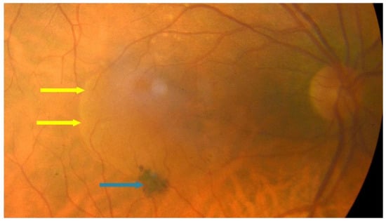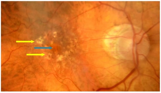 Dry AMD–fundus; yellow arrows point to hard drusen and blue arrow shows atrophy.