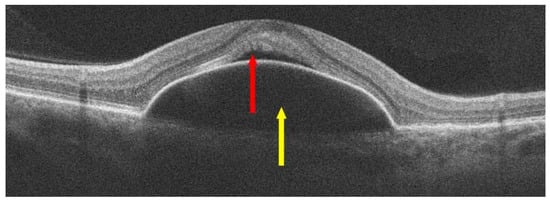 Neovascular age-related macular degeneration (nAMD) before anti-vascular endothelial growth factor (anti-VEGF) injections; red arrow points to SRF and yellow arrow shows macular neovascular membranes (MNV).