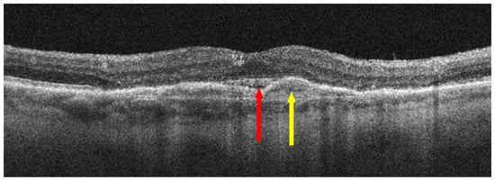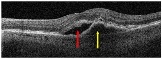 Non-neovascular AMD; yellow arrow shows pigment epithelial detachment (PED) and red arrow shows subretinal fluid (SRF) at the apex of the lesion.
