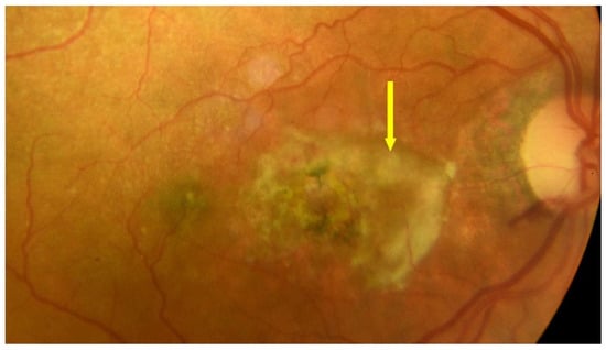 End-stage nAMD fundus; yellow arrow shows scarring.