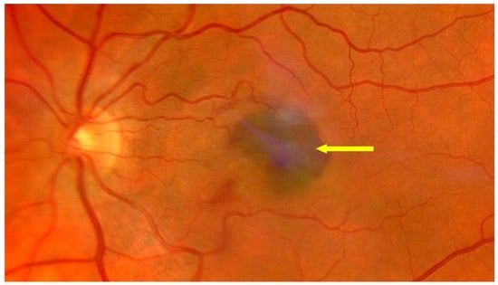 For more than 18 years, nAMD has been treated with intravitreal injections of anti-VEGFs, which are effective first-line treatments for this disease entity. This treatment has, for the first time, offered hope for slowing the progression of the disease to functional blindness and, in some cases, maintaining or even improving VA. Treatment with anti-VEGFs targets one of the critical mechanisms of nAMD development. Despite their effectiveness, anti-VEGF drugs have limitations, including the need for repeated injections with short intervals in between, the need for long-term use, and a decrease in VA associated with progressive geographic atrophy and subretinal fibrotic processes that occur with long-term treatment []. Successful treatment of nAMD requires a short time interval between diagnosis and the first injection of an anti-VEGF. Preferably, treatment should start as early as possible, within two weeks after diagnosis. A delay of over one month increases the risk of vision loss []. The frequency of intravitreal anti-VEGF injections can be reduced by using different treatment regimens, such as treat and extend, in which the intervals between anti-VEGF injections can be as long as 12 to 16 weeks []. Figure 6 shows an OCT scan of active MNV in a patient awaiting intravitreal anti-VEGF injections; Figure 7 shows a post-treatment OCT scan with MNV reduction and residual SRF. Figure 8 shows advanced nAMD, i.e., subretinal fibrosis and disciform scar. Figure 9, Figure 10 and Figure 11 present eye fundus in patients at various nAMD stages. Figure 9 shows an active nAMD process with a giant PED. Figure 10 shows advanced nAMD with a fundus scar: intravitreal injections are no longer administered at this stage, the changes are irreversible, and vision is unlikely to improve. Figure 11 shows hemorrhagic nAMD that certainly requires a prompt intravitreal injection of the anti-VEGF drug.
