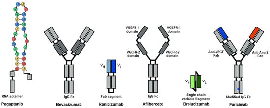 Although intravitreal injections of anti-VEGF drugs are still the gold standard treatment for AMD, new molecules with more potent effects are being introduced. Treatment regimens are being implemented to extend the intervals between intravitreal injections. Pegaptanib was the first to be registered for the treatment of nAMD in 2004 but its effectiveness was at the level of PDT. Bevacizumab, an oncology drug with systemic VEGF-binding properties, has been used off-label to treat nAMD since 2005. There are numerous controversies related to the effectiveness and safety of nAMD treatment with bevacizumab. In 2006, ranibizumab was registered, the first approved anti-VEGF therapy that has dramatically reduced the risk of blindness worldwide. Another anti-VEGF molecule that was approved in 2012 is aflibercept, which shows high effectiveness in the treatment of nAMD and the safety of the therapies. Brolucizumab was registered in 2020. It shows good drug penetration into subretinal structures and high treatment effectiveness; however, clinical trials have shown that it may cause vasculitis, endophthalmitis, and vascular occlusion. A novel anti-VEGF drug, registered in 2022, for the treatment of nAMD is faricimab, the first bispecific antibody designed for intraocular application. It binds and neutralizes both Ang-2 and VEGF-A, thus affecting two different receptor pathways. The schematic structure of anti-VEGF molecules is presented in Figure 12 and individual anti-VEGF drugs are discussed.