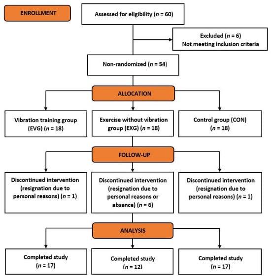 From the 54 women enrolled and qualified for the study, three groups of 18 women each were distinguished: the experimental group with physical training on a vibration platform (EVG), the comparison group performing the same exercise program but without the vibration factor (EXG), and the control group, which did not undergo any physical activity (CON). Allocation of subjects into different groups was done through volunteer sampling—the participants were recruited via posted advertisement at the university and assigned to the group to which they volunteered. The study was completed by 17 women in EVG and CON, and 12 in EXG. The scheme of the recruitment process is shown in Figure 1.