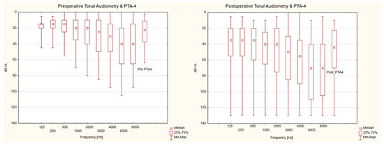 Figure 1 shows also changes in the hearing thresholds for individual frequencies. It can be seen that the most serious hearing loss occurred after surgery for the highest frequencies. In turn, the most limited hearing threshold deterioration was observed for low frequencies.